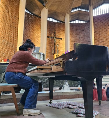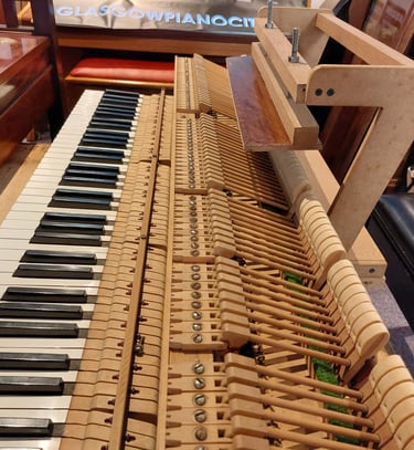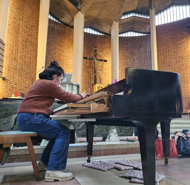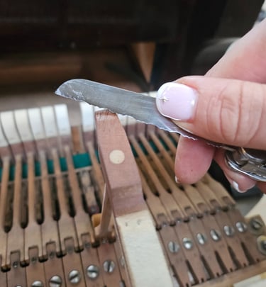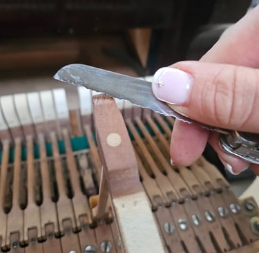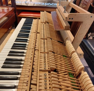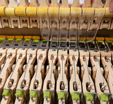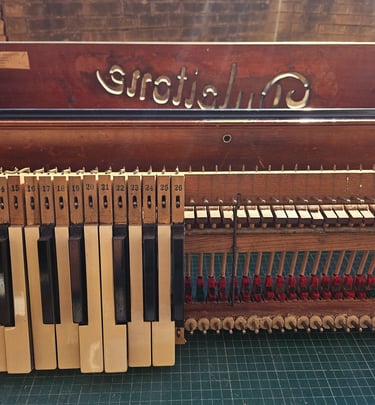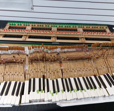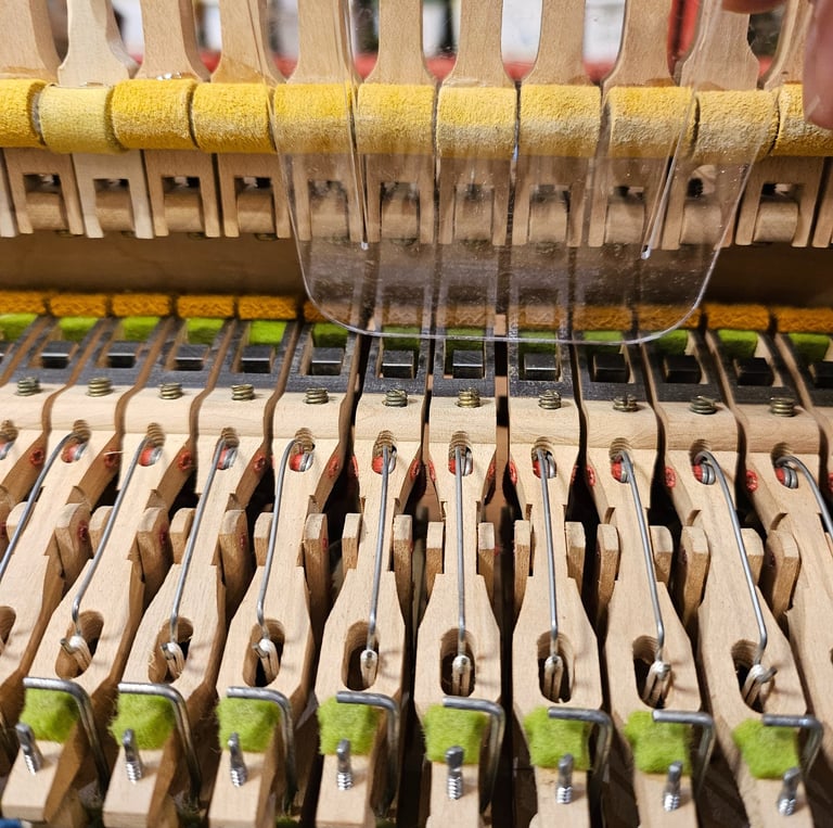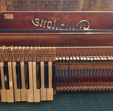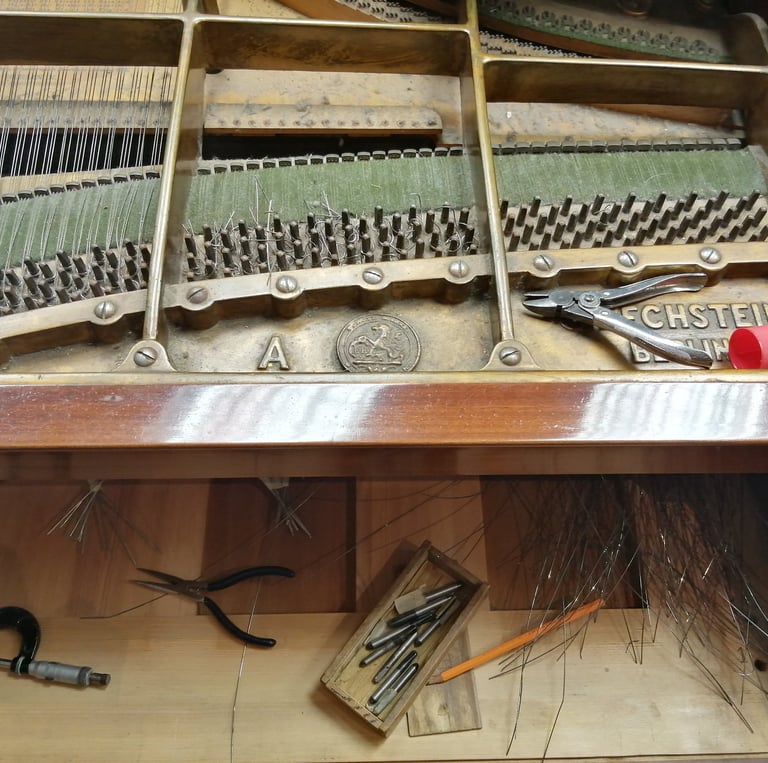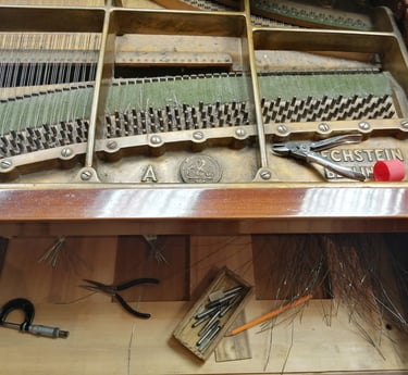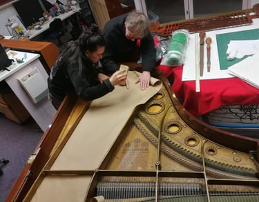 In addition to working as a self-employed technician I also work with Roy O'Neil so that we can undertake larger repair and restoration jobs such as action renovation, full or part re-stringing, and keyboard reconditioning, including works on early keyboard instruments (e.g Harpsichords and Virginals) and rarer instruments such as the Dulcitone. Most common repairs can be done on the road but in some cases it may be necessary to bring the instrument into the workshop.